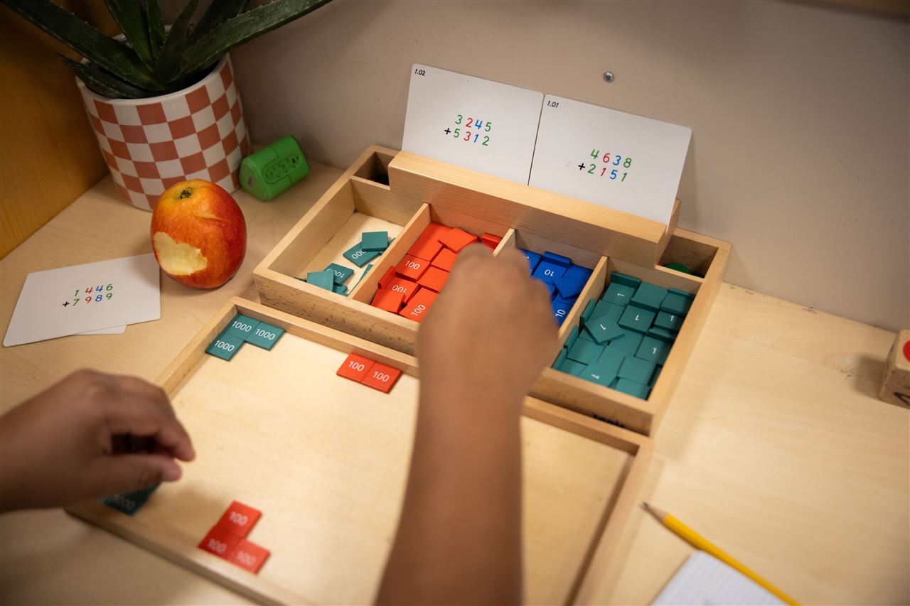 Om de ontwikkeling te stimuleren ontwikkelde Maria Montessori eigen onderwijsmaterialen. Deze materialen zijn er voor verschillende vakgebieden en helpen het kind in de ontwikkeling. Het kan met deze materialen, na een korte instructie, zelf langere tijd geconcentreerd en aandachtig aan de slag. De materialen zien er aantrekkelijk uit, sluiten aan bij de ontwikkelingsfase van het kind en stimuleren het kind. Deze materialen worden voornamelijk ingezet in de onderbouw. In de midden- en bovenbouw gaan de kinderen van het werken met materialen over naar het abstract werken en worden de materialen mede ingezet ter ondersteuning van het onderwijsaanbod.